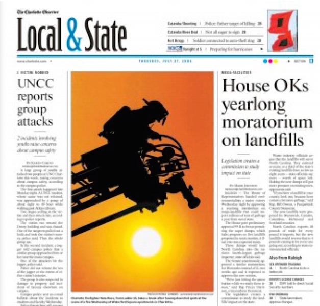 2006 – Partick Schneider – Charlotte ObserverNel caso di José Luis Rodriguez (2009) non ci troviamo di fronte ad una manipolazione d’immagine, ma entriamo nell’etica del racconto in quanto nella descrizione dell’immagine (vincitrice del Concorso Veolia Environnement Wildlife Photographer of the year) lo stesso aveva dichiarato che si trattava di un lupo in via di estinzione che aveva appostato per mesi.