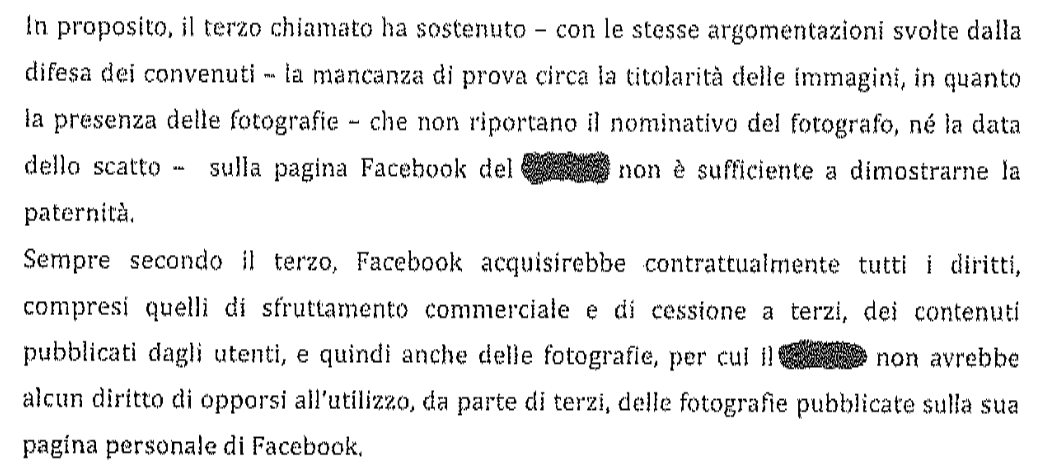 Secondo quanto indicato dall’Editore (vedi pag. 5 della sentenza), le immagini pubblicate sul social network contrattualmente cedono i diritti interamente…