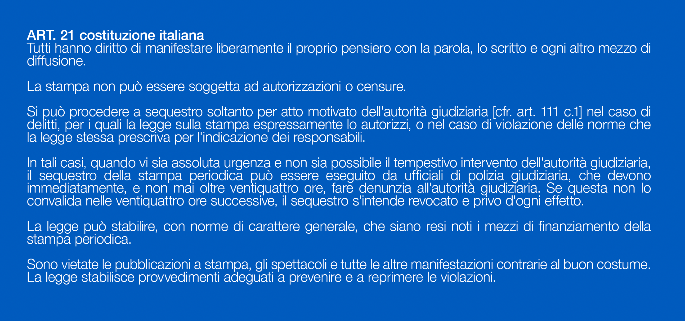 Ma cosa dice, per esteso, l’Art. 21 della costituzione (quello che volgarmente viene definito “diritto di cronaca”)? Leggiamo: