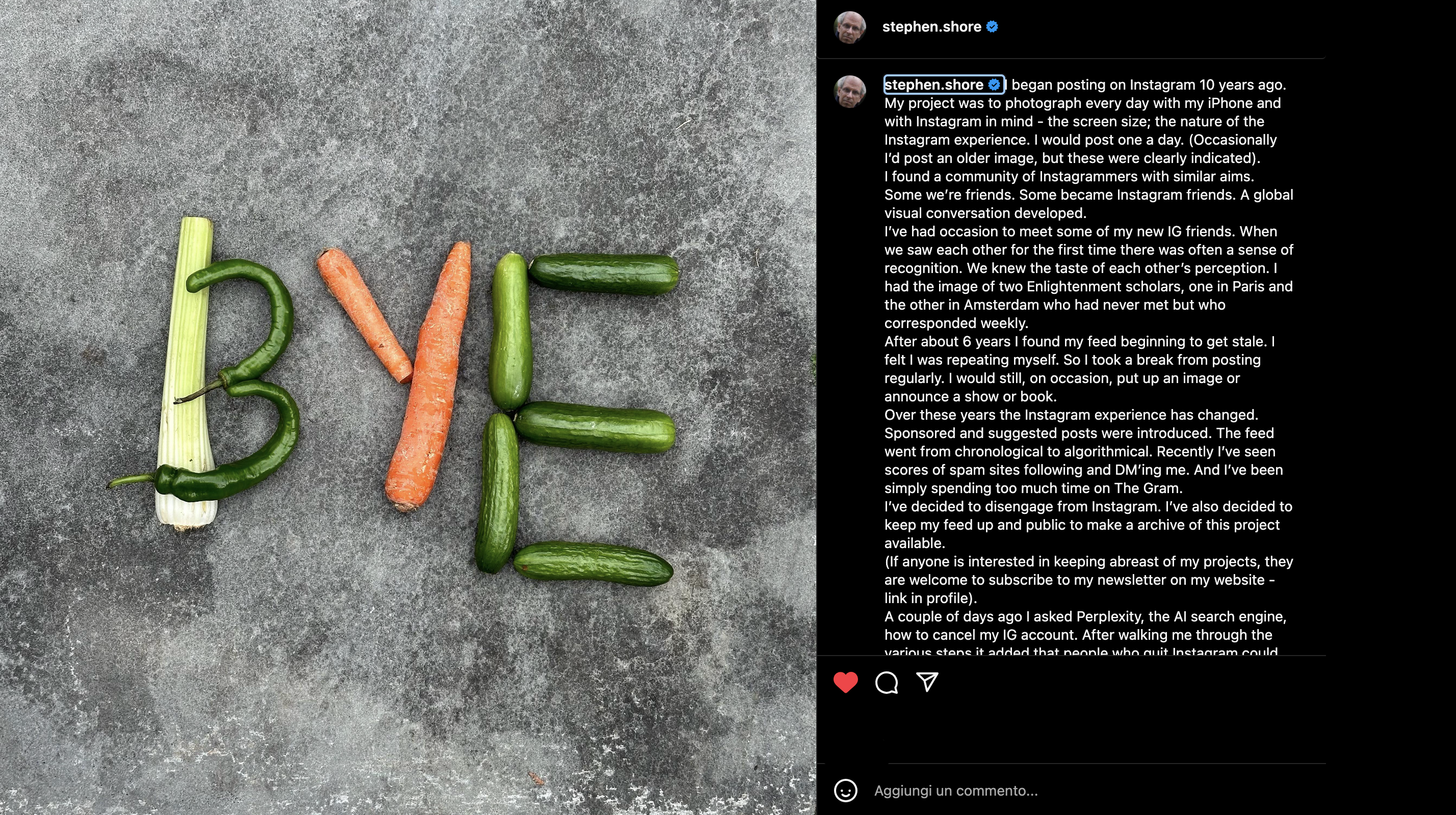 Il 17 marzo (giorno di San Patrizio, ma la cosa è irrilevante) uno dei più grandi fotografi contemporanei, Stephen Shore, ha deciso di fare un post per comunicare il suo allontanamento da Instagram.