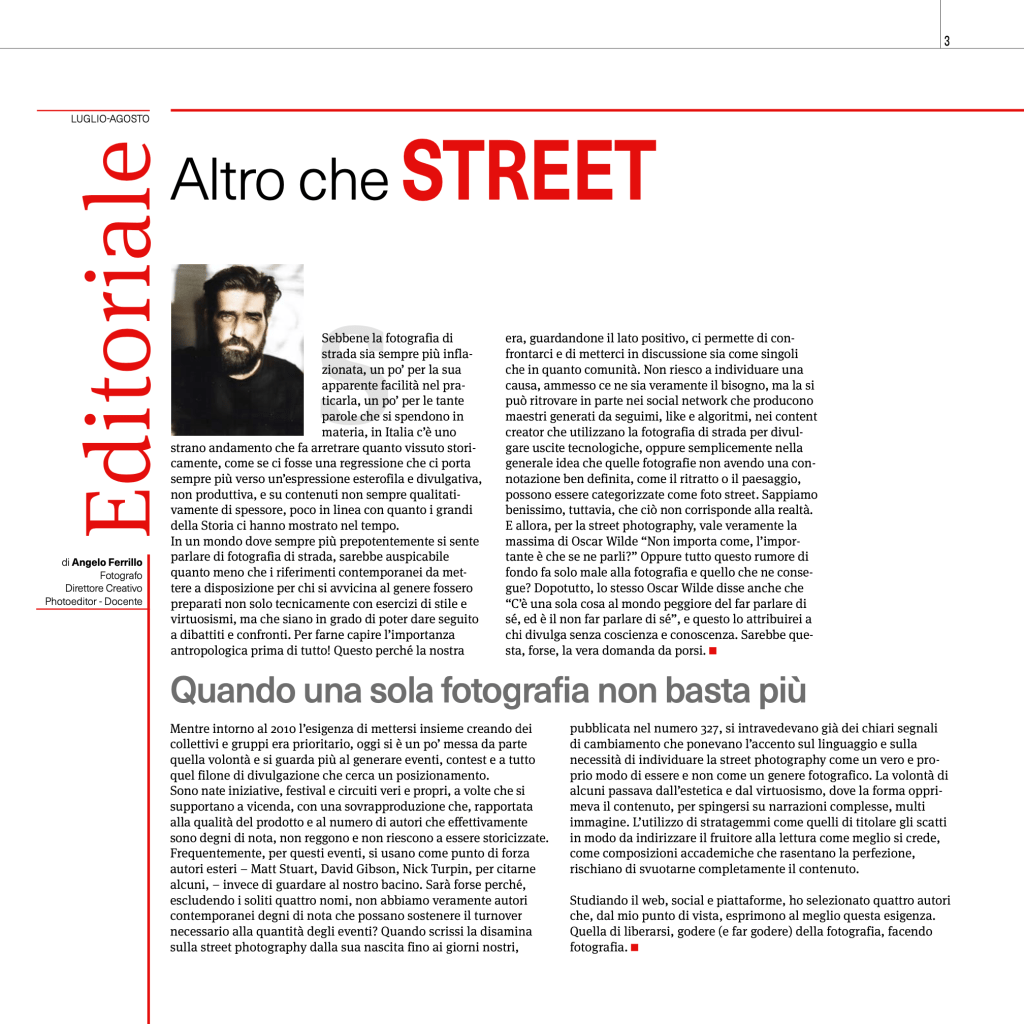 Per il numero di luglio/agosto 2024 de IL FOTOGRAFO (che trovate in edicola o direttamente sul sito della casa editrice) ho scritto l’Editoriale e un articolo che introduce quattro autori. Qui di seguito il testo integrale.